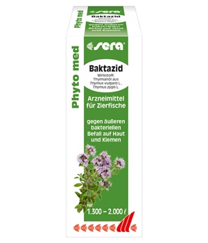 Através de seus ingredientes naturais, as doenças de seus peixes ornamentais são tratadas suavemente e sem produtos químicos. O Sera Phyto med Bactazide é, portanto, particularmente compatível e fácil de usar.